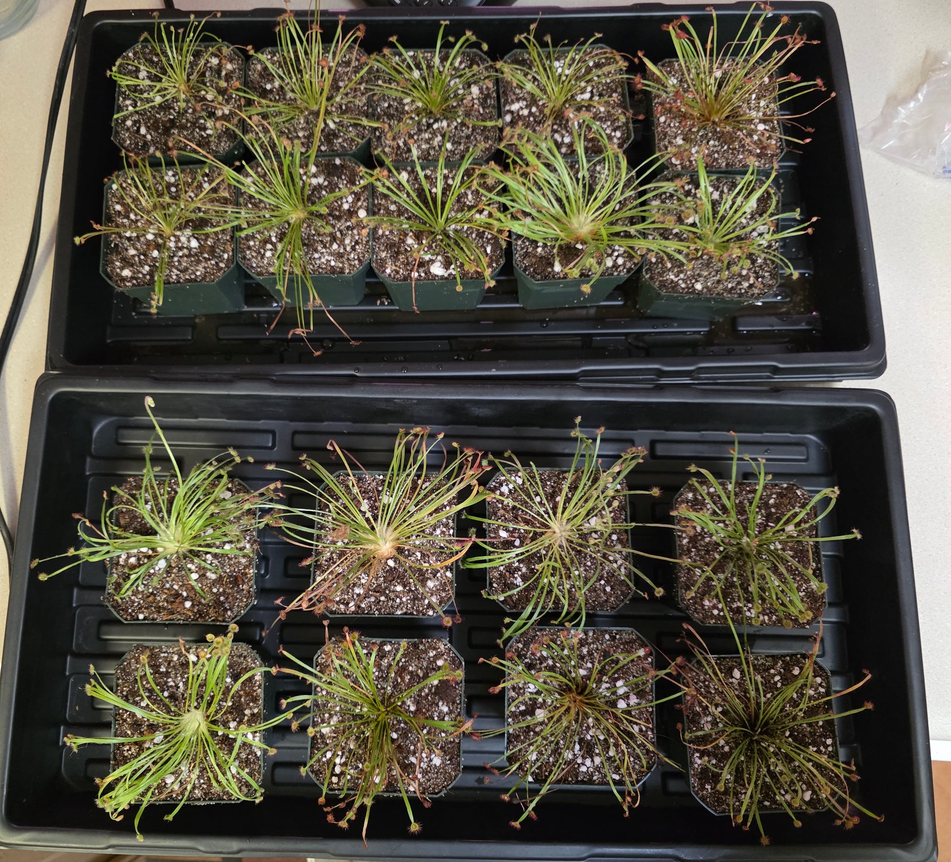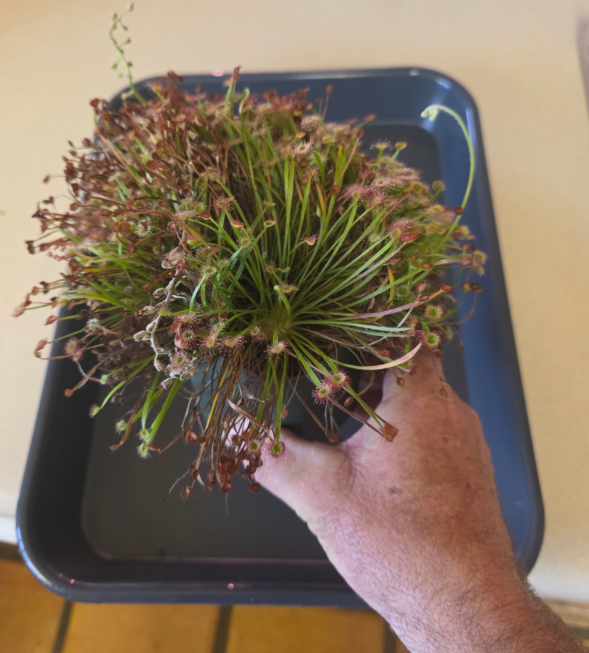 Drosera dilatato-petiolaris is from western and northern territories of Australia. The do appreciate being quite warm, but special setups are not always required for some of the easier petiolaris Drosera such as this one, or minimal effort like a seedling heater under the pot. Peat and perlite can work just fine, but for these guys I go with 2/1/1 peat/perlite/sand mix. 3.5" is a great size for these plants, they can get up to around 5", as shown in photos. Plants will clump over time. There are lots of good guides on growing these beautiful and unique plants on Terraforums.com and otherwise on the internet such as this one discussing dormancy (which I almost completely bypass by keeping warm and wet as mentioned in the post) https://terraforums.com/forums/threads/crash-course-guide-for-petiolaris-dormancy.129846/